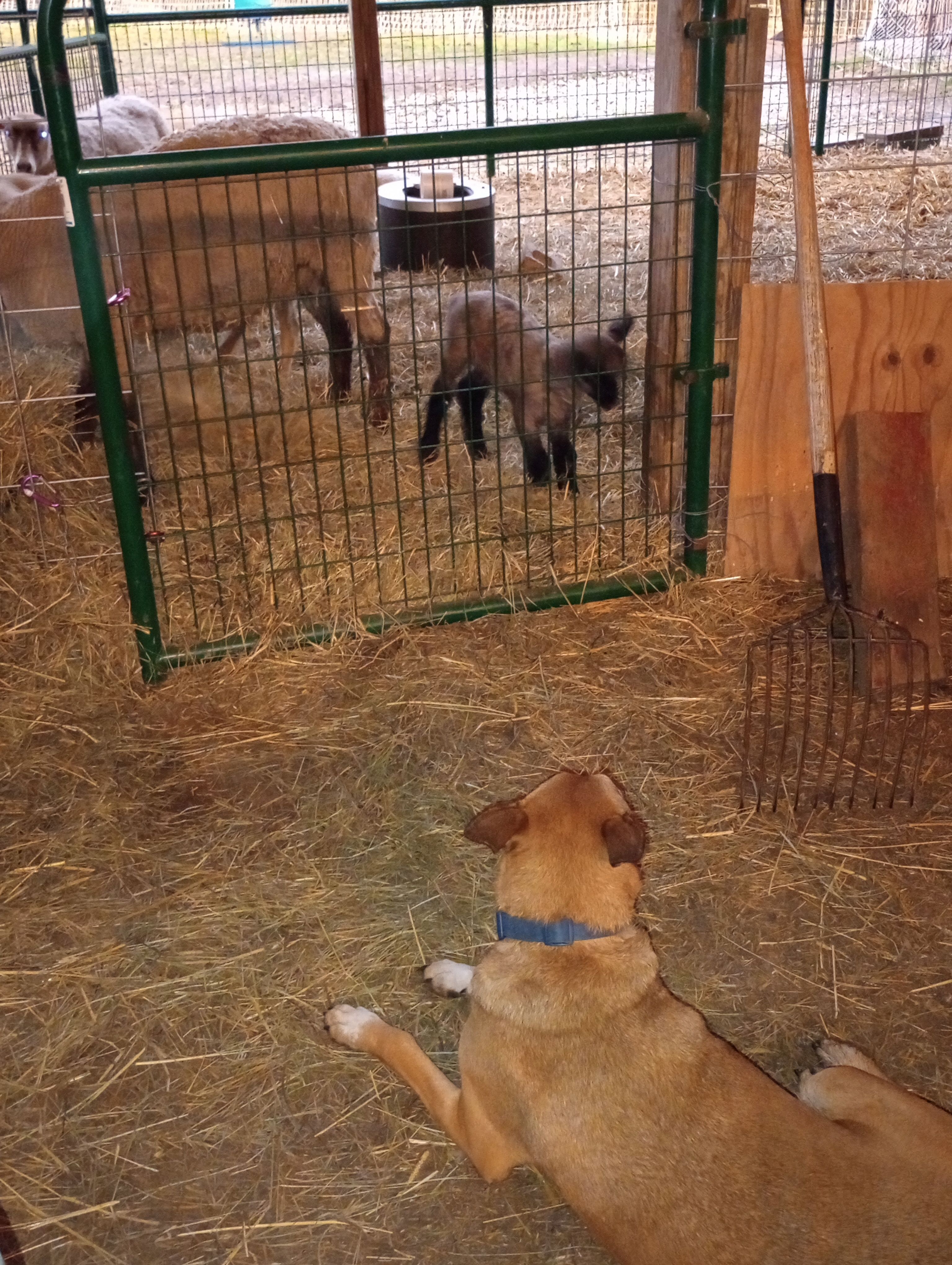 Mia watching the lambs. During chores, she sits and watches, ears flicking up and down with interest.