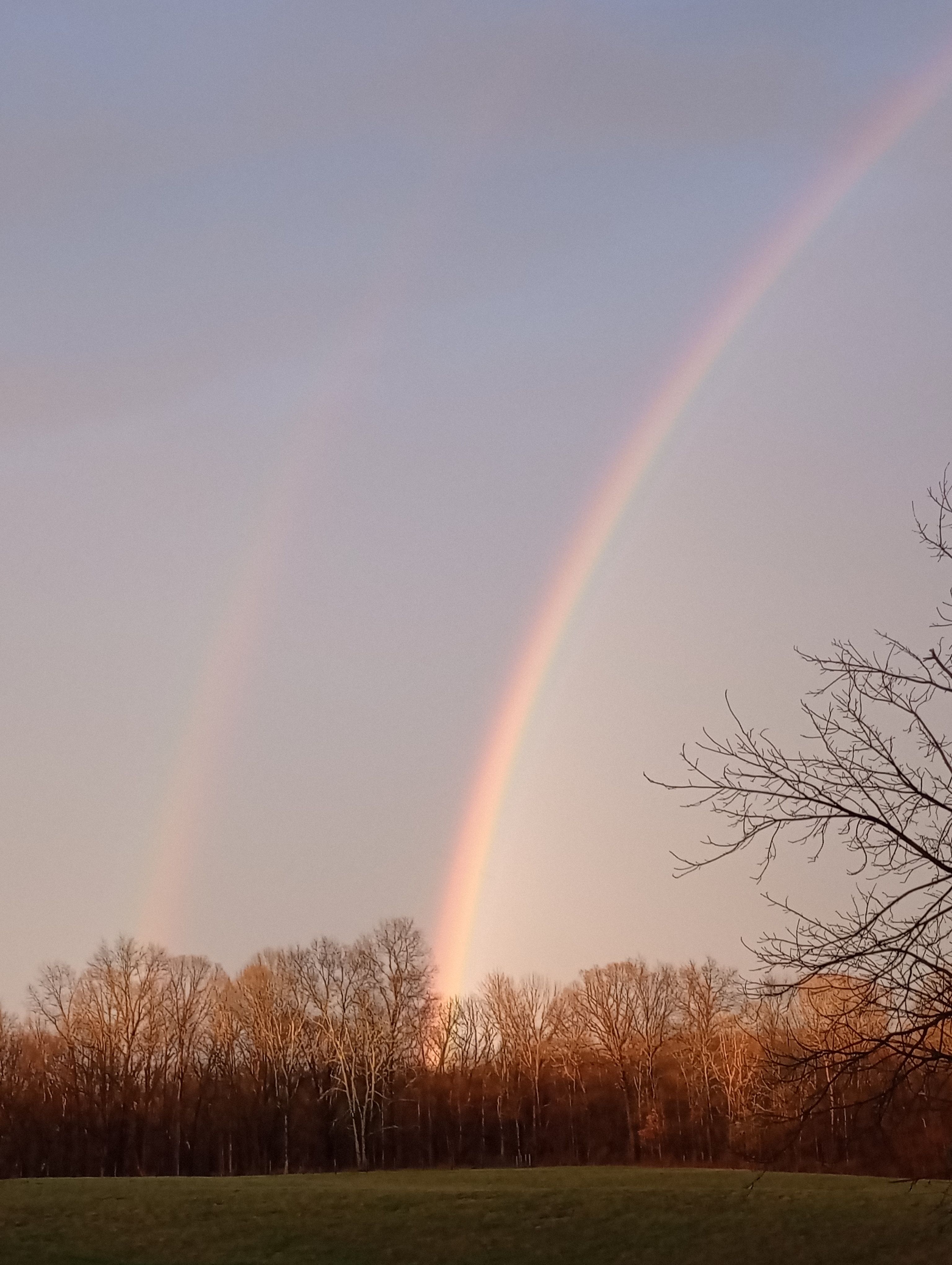 Right as Jeff drove into the barnyard Thursday evening with our baby Christmas trees, a double rainbow arced over the farm.