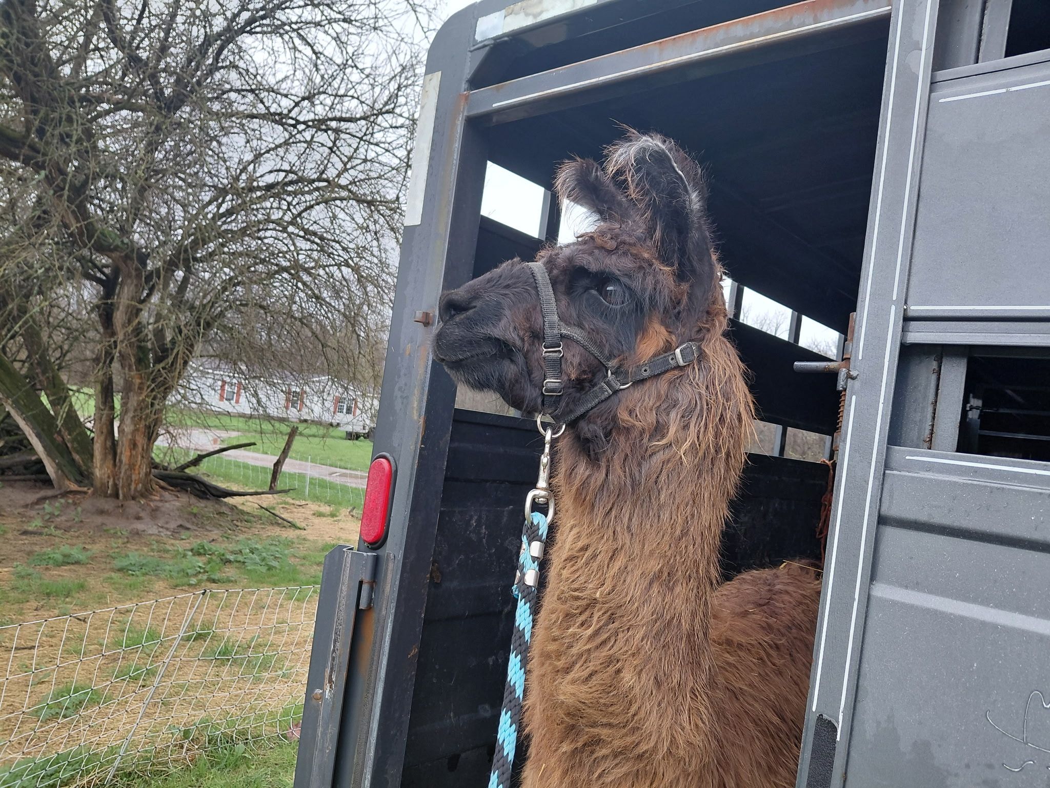 But the cattle moved to another farm, and Lenny stayed with his fellow llamas, so he didn't have a job. He's now moved to our farm, and he'll be guarding the sheep and goats along with Daishin.